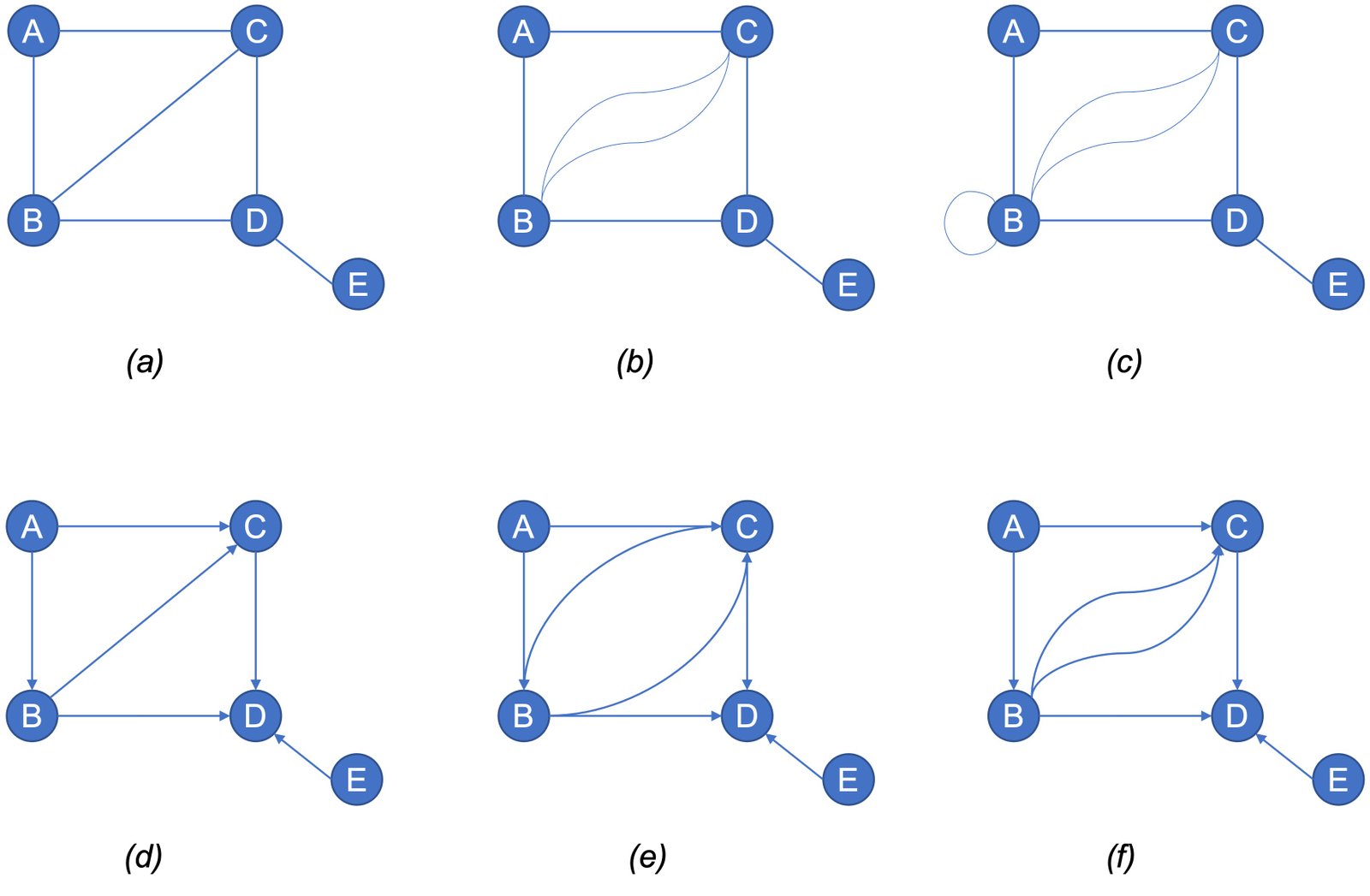 Bên cạnh việc trình bày các loại đồ thị, Hình 3 cũng trình bày hai tính chất quan trọng ứng với mỗi loại đồ thị, gồm cạnh song song (parallel edge/multi-edge) và cạnh khuyên (loop/self-loop). Trong đồ thị vô hướng, một cạnh nối hai đỉnh bất kỳ luôn được xem là không có tính thứ tự; và ngược lại, trong đồ thị có hướng, tính thứ tự của một cạnh được quy định bởi chiều giữa hai đỉnh. Cạnh song song là tập hợp những cạnh có cùng chung một đỉnh đầu và một đỉnh cuối. Cạnh khuyên là cạnh nối từ một đỉnh đến chính nó, ký hiệu \((u,u) \in E\). Hình 4 thể hiện một số ví dụ về đồ thị vô hướng, đồ thị có hướng, cạnh song song, và cạnh khuyên. Chúng ta lưu ý rằng đồ thị (e) trong Hình 4 là đơn đồ thị có hướng, do cặp cạnh \((B,C) \in E\) và \((C,B) \in E\) không có cùng đỉnh đầu và cuối. Đồ thị (f) trong Hình 4 là đa đồ thị có hướng do tồn tại hai cạnh song song \((B,C) \in E\).