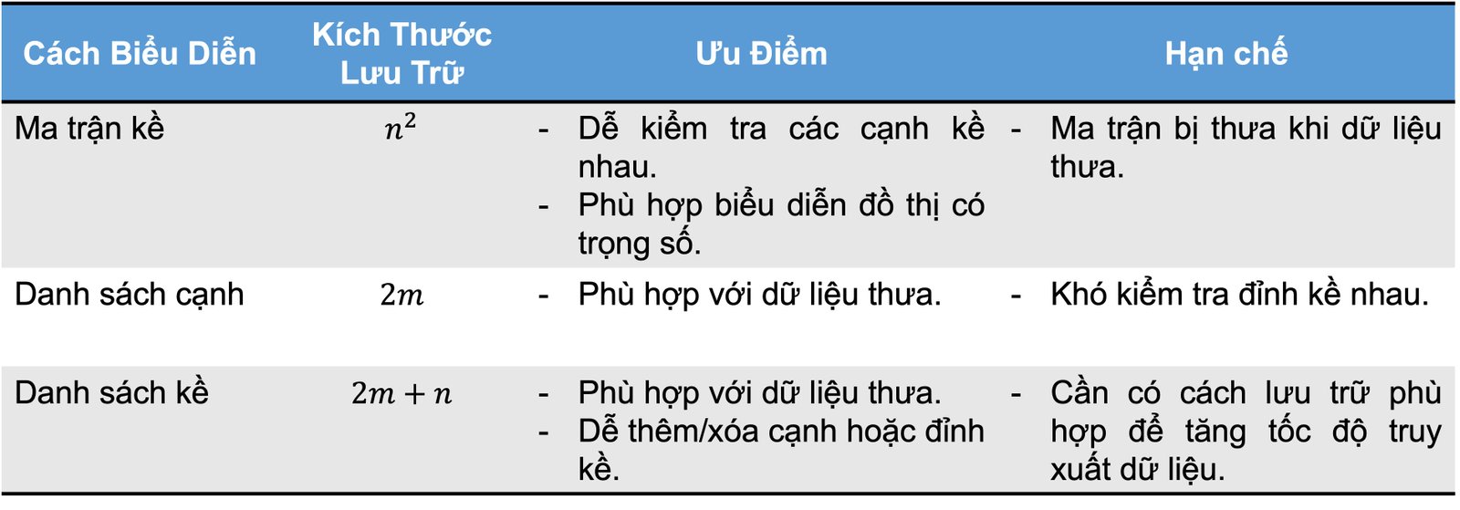 Để so sánh được sự khác nhau về tính chất của ba cách biểu diễn đồ thị lần lượt là (1) ma trận kề, (2) danh sách cạnh, và (3) danh sách kề, chúng ta sẽ đề cập đến các yếu tố như không gian lưu trữ, ưu điểm và hạn chế của từng cách biểu diễn, như trình bày trong Hình 11.